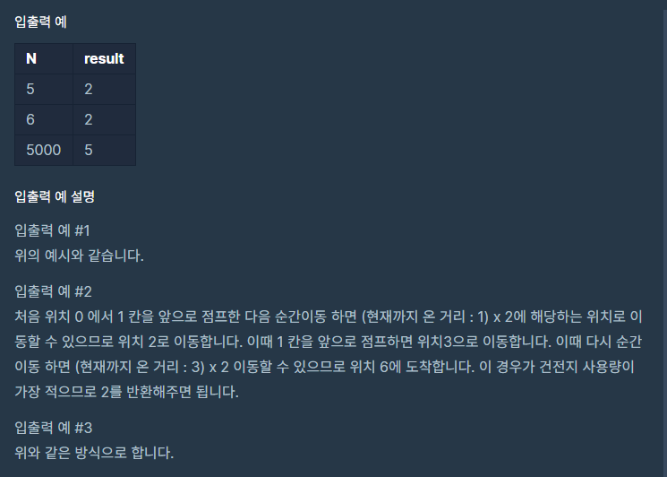 [알고리즘] 프로그래머스 점프와 순간 이동 -Summer/Winter Coding(~2018)- 본문