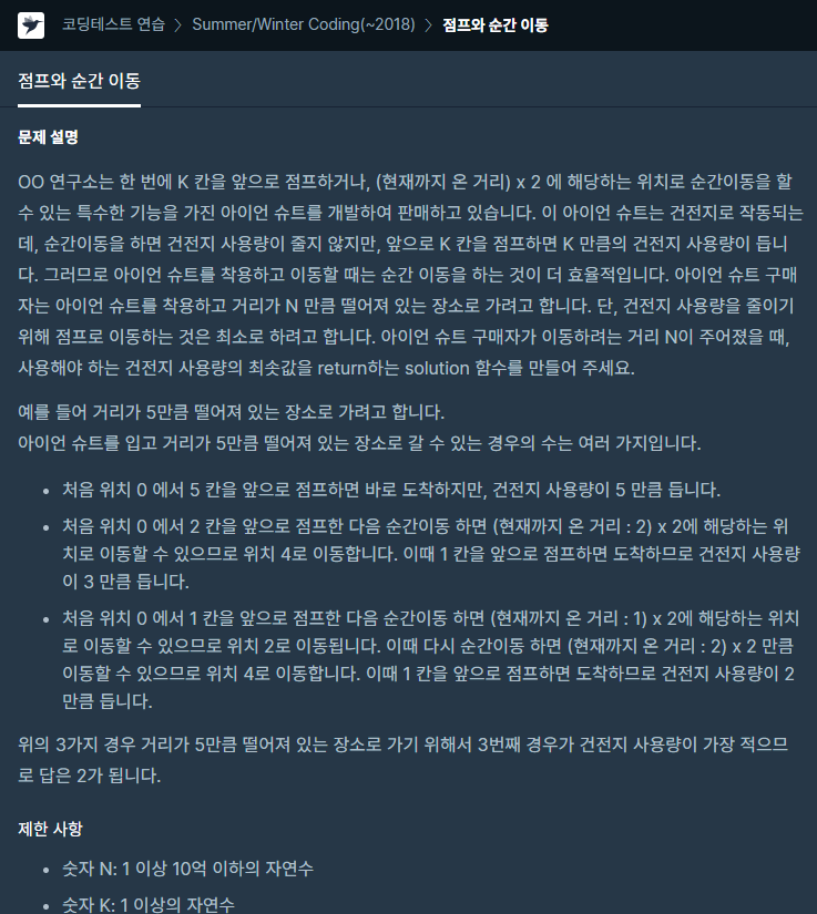 [알고리즘] 프로그래머스 점프와 순간 이동 -Summer/Winter Coding(~2018)- 본문