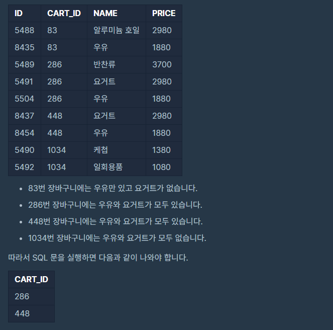 [SQL] 프로그래머스 우유와 요거트가 담긴 장바구니 -이중쿼리- -Summer/Winter Coding(2019)- 본문