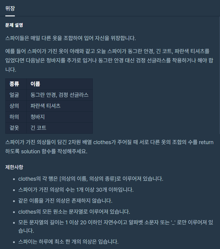 [알고리즘] 프로그래머스 위장 -해시(hash)- 본문