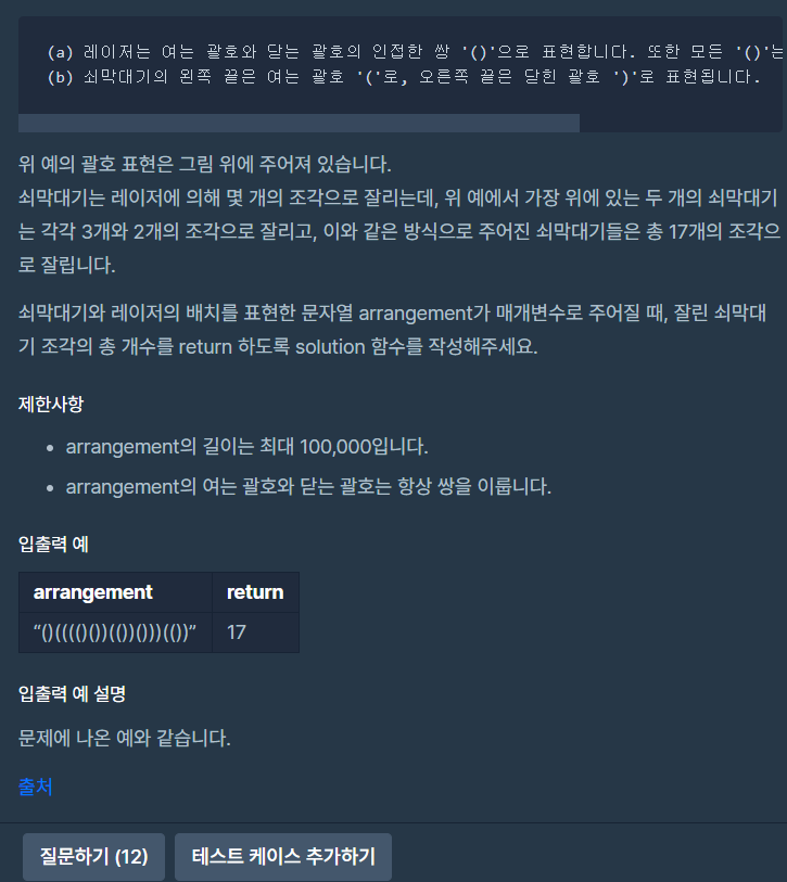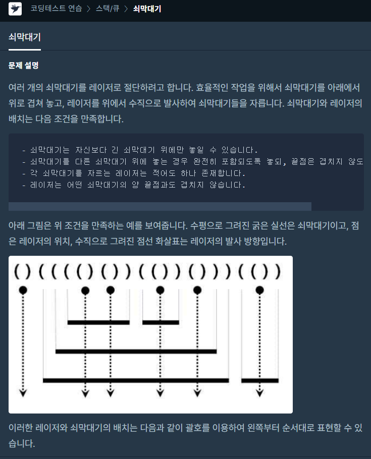 프로그래머스 LEVEL2 문제 쇠막대기를 풀어봤습니다.