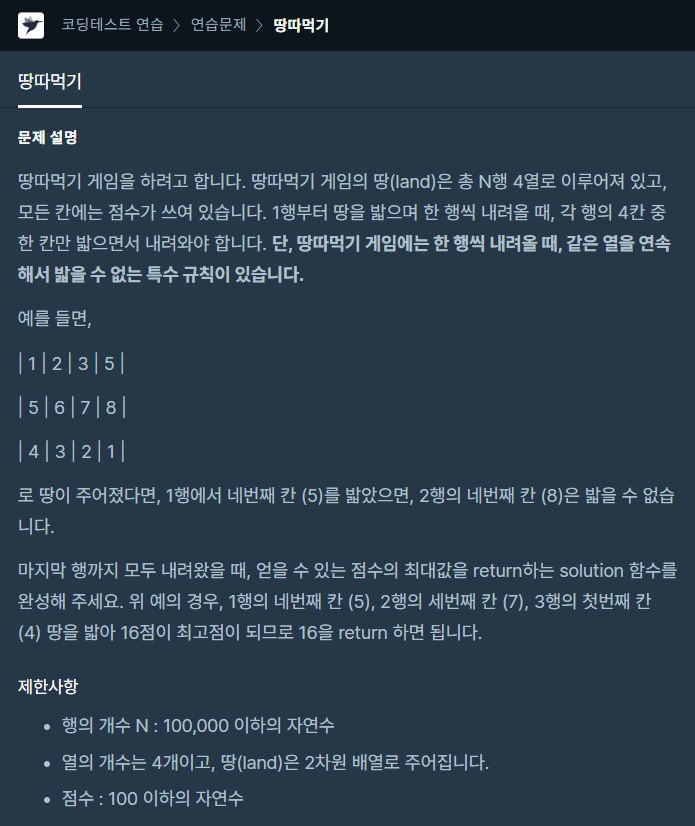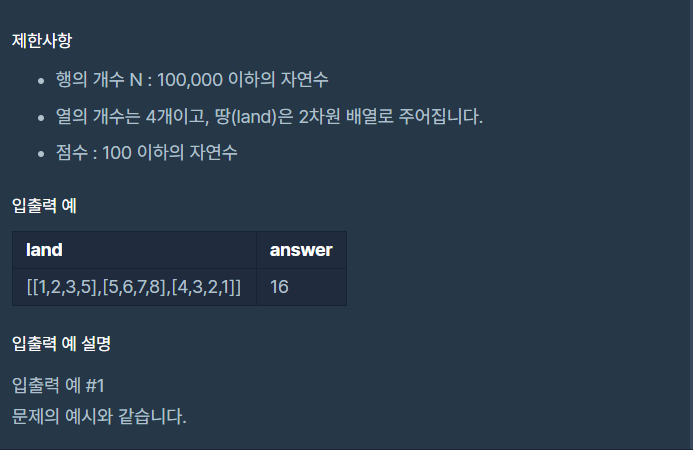 땅따먹기 게임을 하려고 합니다. 땅따먹기 게임의 땅(land)은 총 N행 4열로 이루어져 있고, 모든 칸에는 점수가 쓰여 있습니다. 1행부터 땅을 밟으며 한 행씩 내려올 때, 각 행의 4칸 중 한 칸만 밟��