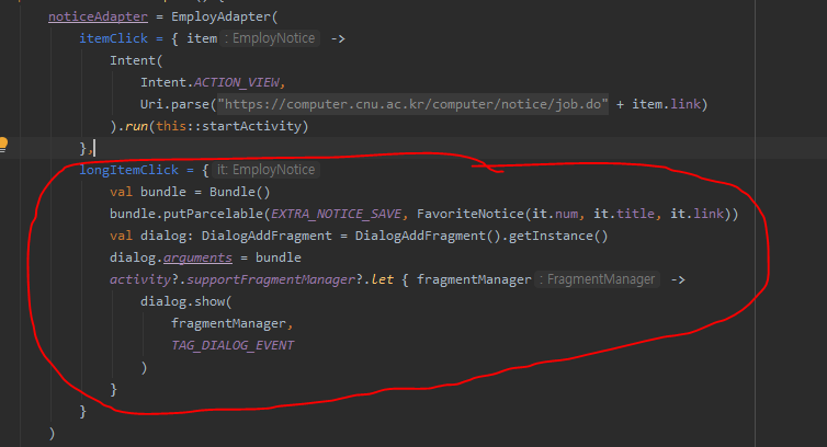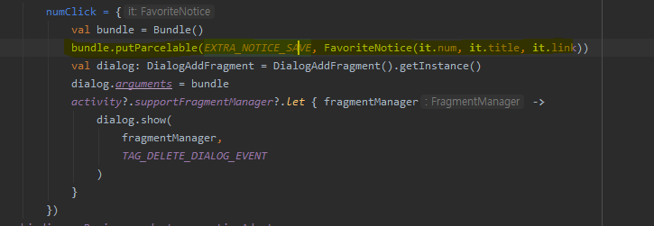 EXTRA_NOTICE_SAVE 는 원하는 태그 값을 넣어주면 됩니다. ( 추가로 번들에 전달된 값을 통해 여러 프래그먼트에서 하나의 다이얼로그를 사용하는 경우가 있을텐데 상황에 따른 텍스트 변경 같은 것도 가능합니다. => 예를들어, 위 다이얼로그처럼 모양은 같은데 질문만 달라야하는 경우 하나의 다이얼로그를 다시만들 필요가 없고 분기처리해서 텍스트만 변경해주는게 가능합니다.)