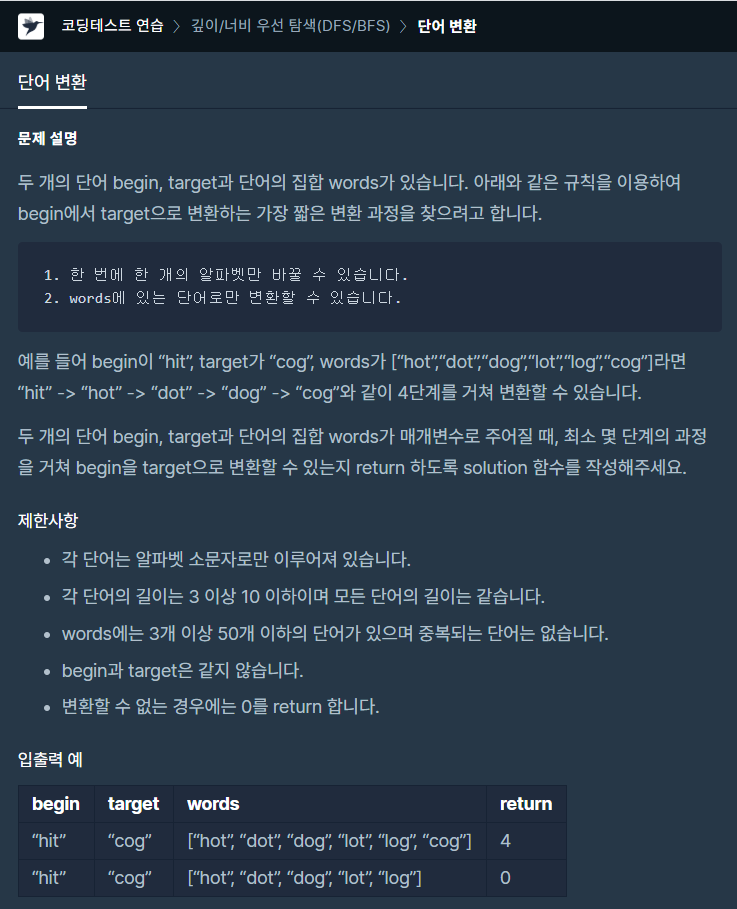 프로그래머스 LEVEL3 단어 변환 문제를 풀어봤습니다.