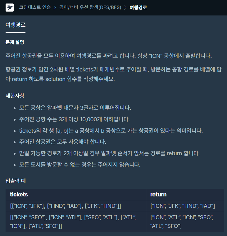 프로그래머스 LEVEL3의 여행경로 문제를 풀어봤습니다.ㅎㅎ