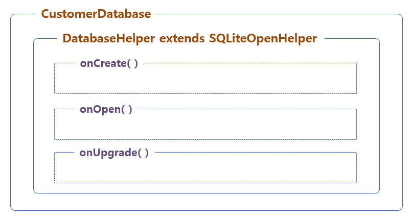 그래서 위와 같은 경우 사용할 수 있는게 헬퍼클래스 즉, SQLiteOpenHelper 이다. SQLiteOpenHelper를 사용하면 기존에 테이블이 있는지 없느지 판단하여 각각에 알맞게 데이터베이스 테이블을 업그레이드 시킨다는가 새로 생성할 수 있다. 이러한 로직을 밑에 그림과 같이 onCreate(), onOpen(), onUpgrade()에 구현하면 된다. 추가로 간단히 설명하자면 onOpen은 데이터베이스 오픈관련, onCreate()는 데이터베이스 테이블을 처음 생성해주는 경우, onUpgrade는 기존에 테이블이 이미 생성되있고 이것을 업그레이드(구조를 수정한다던지)하는것을 구현하면 된다.