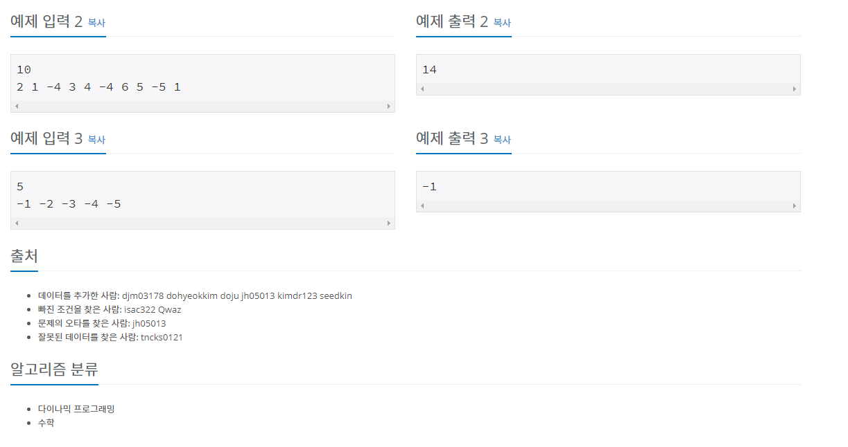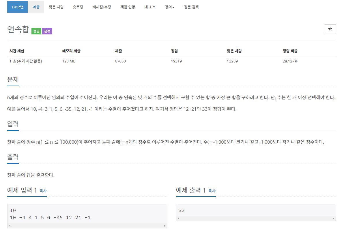 백준 동적계획법1 (dp) 단계별 풀기에 있는 연속합 문제를 풀어봤습니다. ㅎㅎ