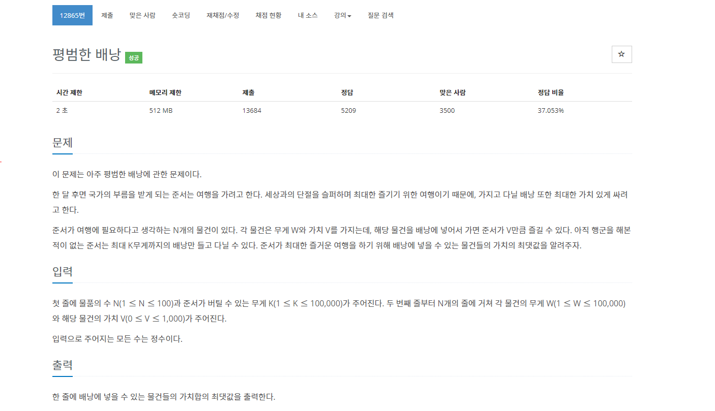 12865번: 평범한 배낭
