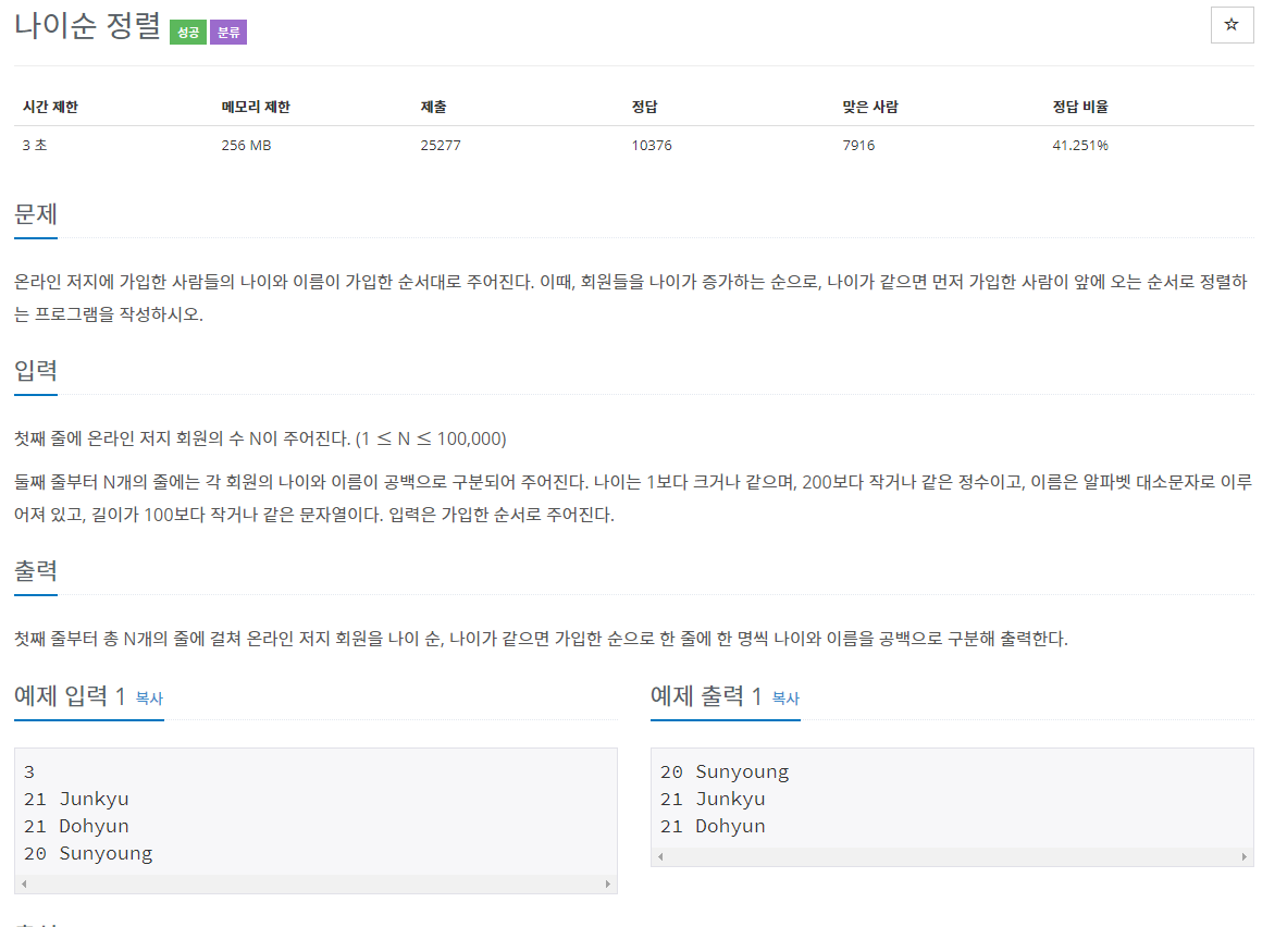백준 단계별풀기 정렬 마지막 단계인 나이순 정렬을 풀어봤습니다.