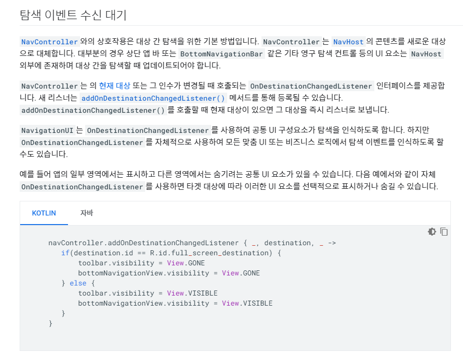 처음에 이동시 바텀네비뷰를 직접 바꿔줘야하나 했는데 문서에서 Jetpack Navigation 에서 제공하는 방법이 있더라고요 ㅎㅎ