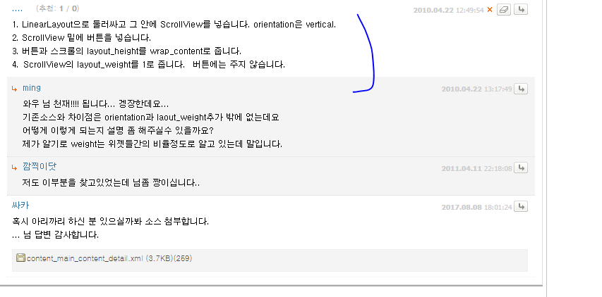 안녕하세요 의외로 잘 안되는 부분이 있어 문의 드립니다. xml에서 맨아래 고정Button하나를 제외하고 윗부분은 Scrollview로 만들고 싶습니다. ...