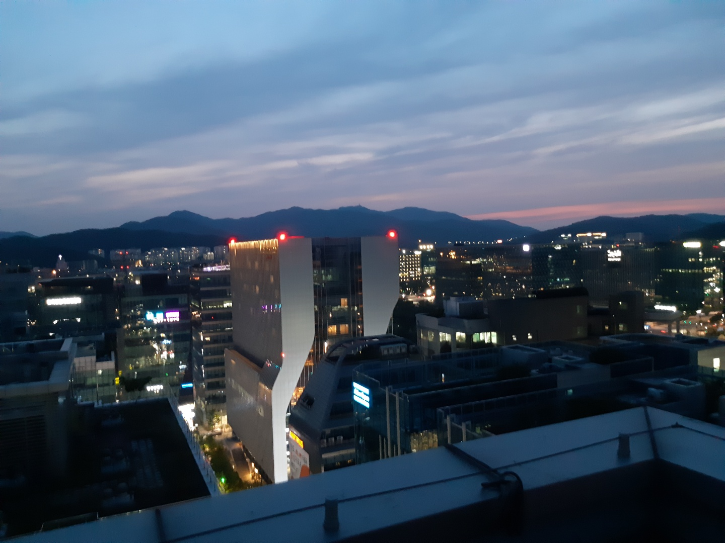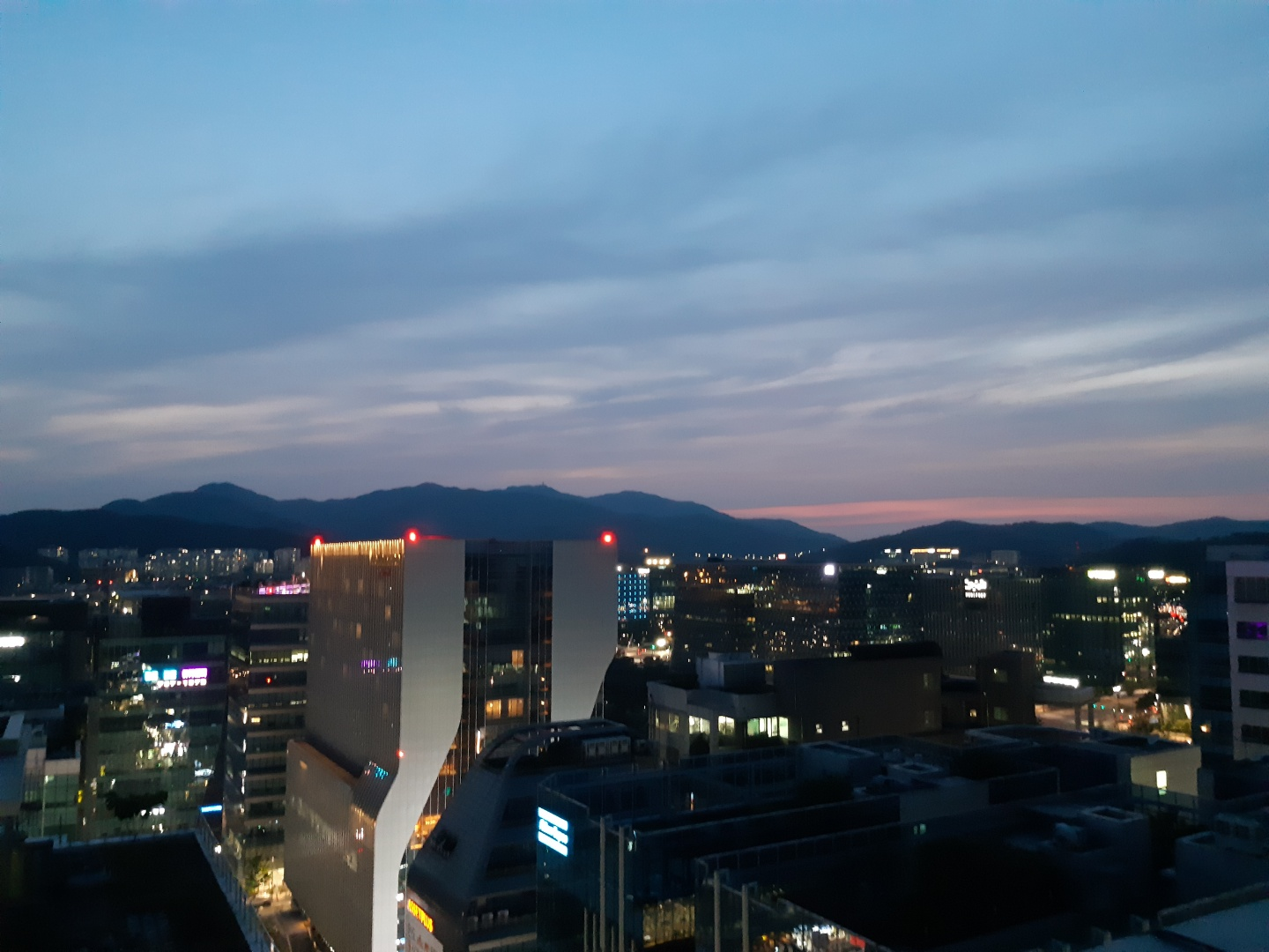 방 안에서의 바깥 풍경인데 고층 건물들이 매우 많습니다.