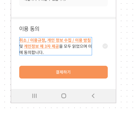 <string name="a"><b>취소 / 이용규정</b>, <b>개인 정보 수집 / 이용 방침</b> 및 <b>개인정보 제 3자 제공</b>을 모두 읽었으며 이 에 동의합니다.</string>