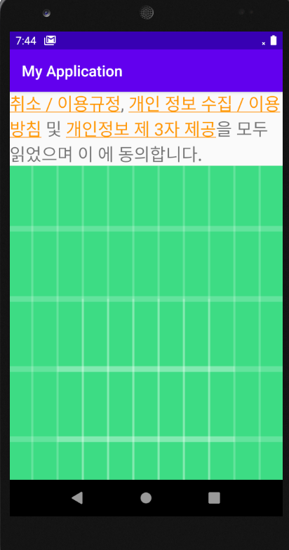 그리고 굵기를 위해서는 string.xml 에서 링크에 해당하는 글자에 <b> 태그를 주어 굵기를 주었고 코틀린에서는 Html.fromHtml 함수를 통해 html을 적용시켜 주었습니다.