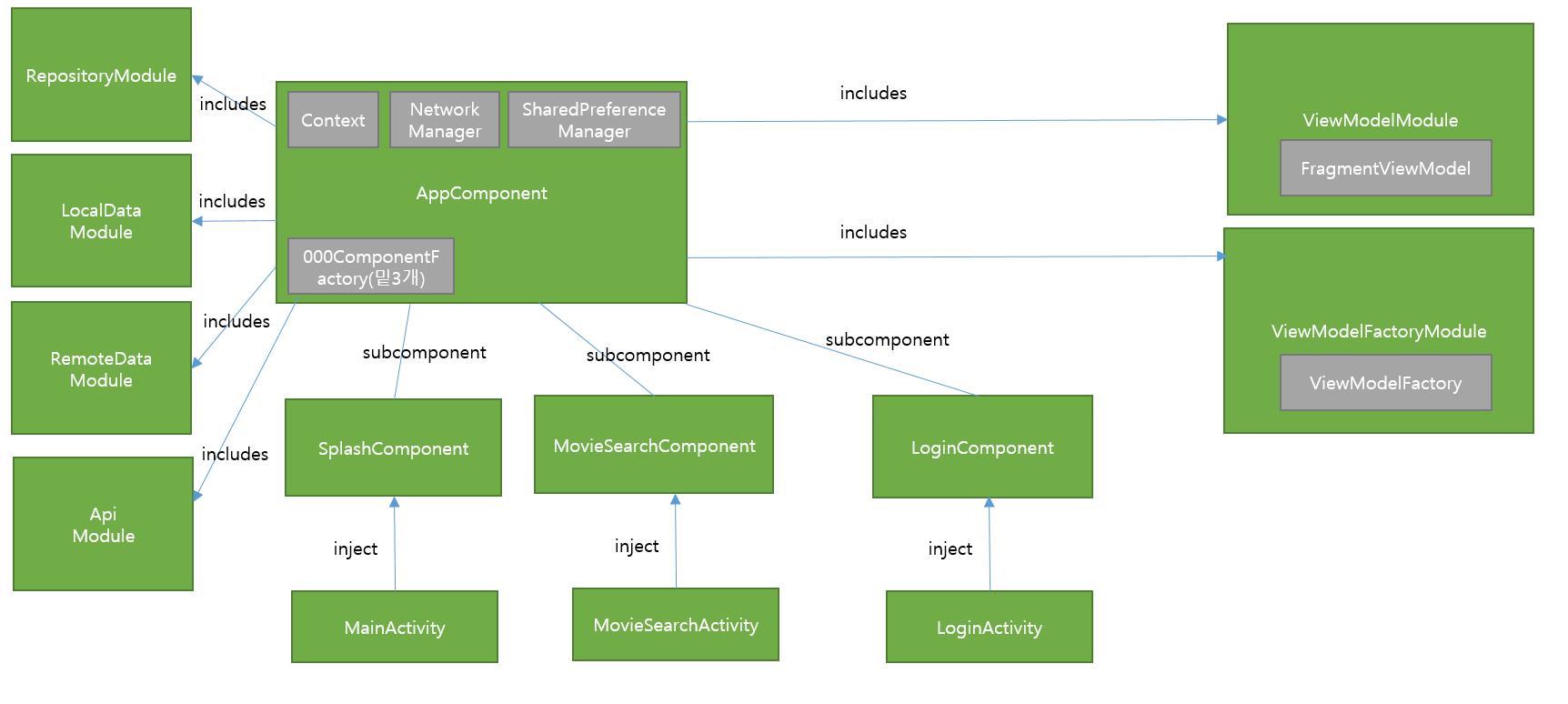 현재 하고 있는 프로젝트에 적용하기 전에 예전에 만든 영화검색앱 샘플 프로젝트에 간단하게 적용해봤습니다. 다른 앱은 싱글 액티비티(SPA) 구조여서 서브컴포넌트가 하나로 해놨지만 이 영화 앱과 DI 그래프 구조가 크게 달라질 것 같진 않습니다.