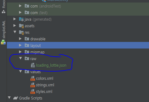 3. Raw 리소스 폴더를 생성하고 다운받은 json 파일을 복사붙여넣기 해줍니다. asset 폴더로 하는 방법도 있는데 전 build를 해도 인식을 못하길래 이와 같은 방법으로 했습니다.