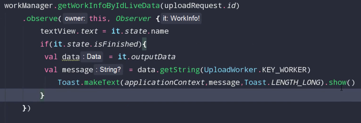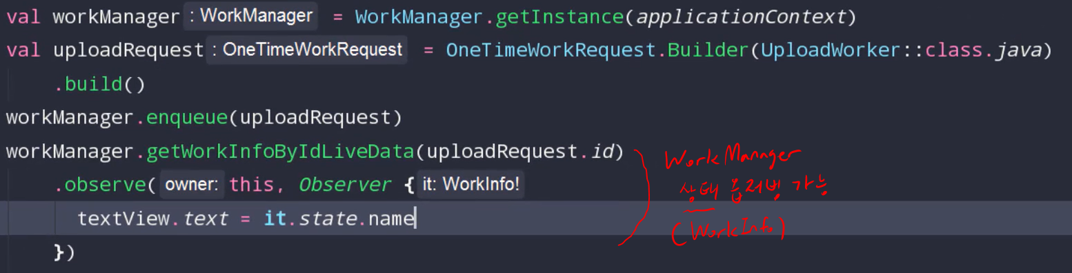 주제와 별개로 WorkManger의 기능 중 하나를 더 알아보겠습니다. 다음사진과 같이 WorkManager의 상태를 옵저빙하여 처리할 수 있습니다. 사용방법은 getWorkInfoByIdLiveData() 매개변수로 WokrManagerRequest 의 ID 를 넣어주면 됩니다. !