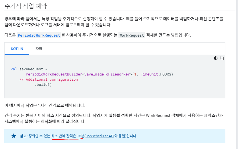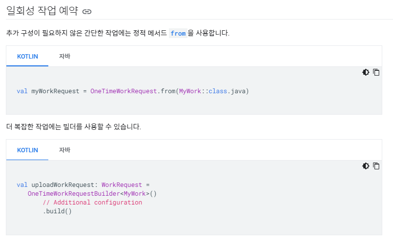 그리고 저는 한번만 실행시킬것이기 떄문에 OntTimeWorkRequestBuilder를 사용했는데 주기적으로 사용할분들은 PeriodicWorkRequest를 사용하시면 됩니다.