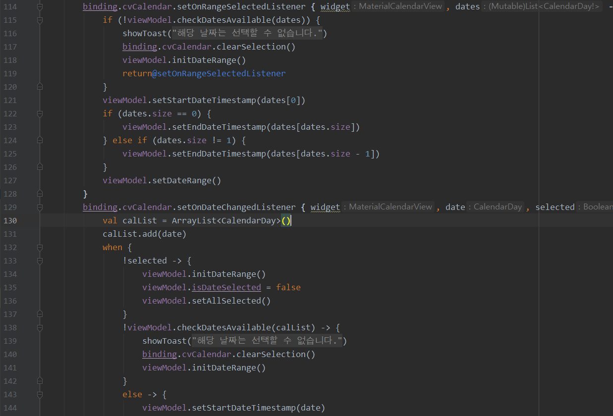 그리고 setOnRangeSelectedListener 의 경우 시작날짜와 선택날짜를 선택한 경우 콜백이 올텐데 이 범위에 있는 날짜들을 모두 포함한 CalendarDay 라는 타입의 리스트로 오게 됩니다.