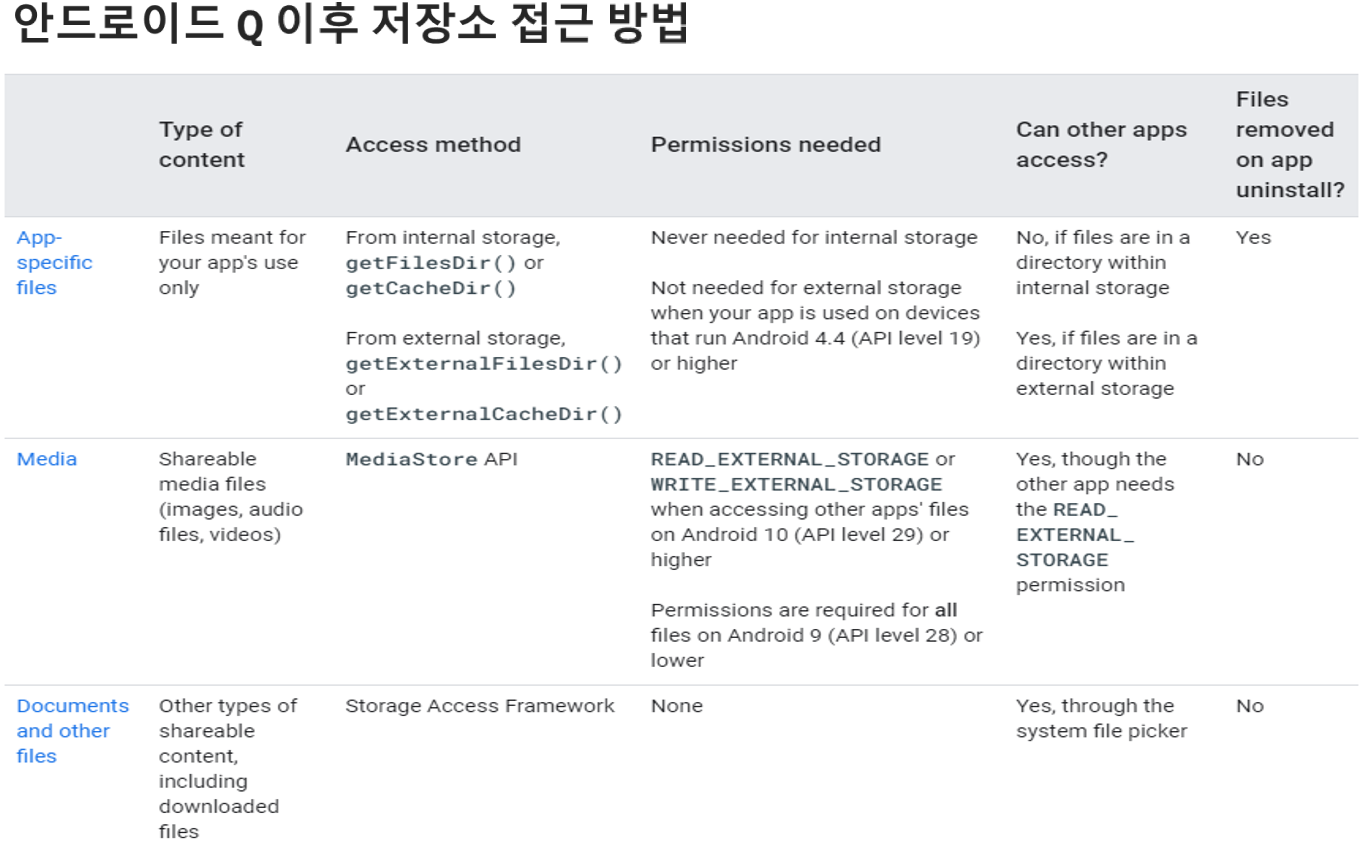 MediaStore API 외에 File API, Storage Access Framework 를 통해서도 접근 가능하나 구글에서는 다음 사진과 같이 MediaStore 사용을 권고하고 있습니다.