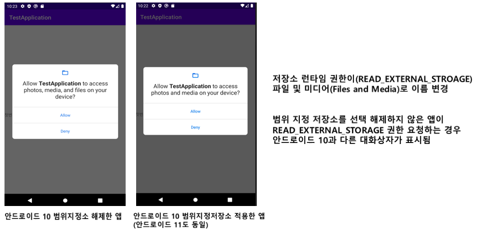 안드로이드 11부터는 범위 지정 저장소를 선택 해제하지 않은 앱이 READ_EXTERNAL_STORAGE권한을 요청하는 경우 Android 10과 다른 대화상자가 사용자에게 표시됩니다.