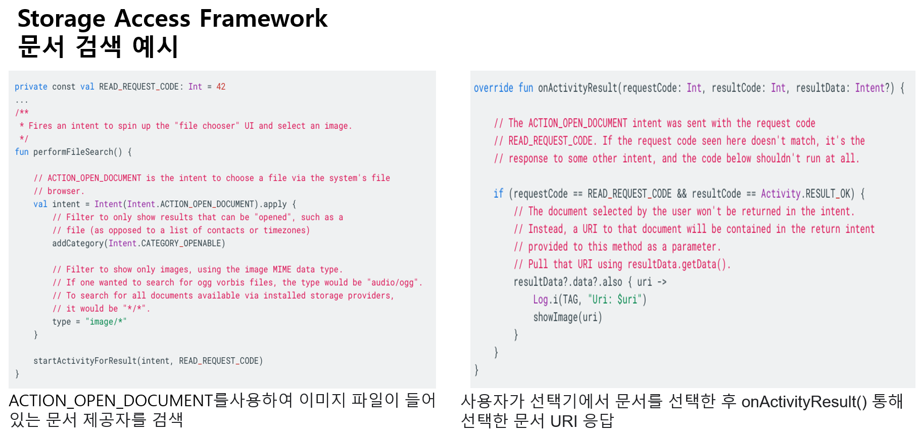 왼쪽은 ACTION_OPEN_DOCUMENT를사용하여 이미지 파일이 들어 있는 문서 제공자를 검색하는 코드이고