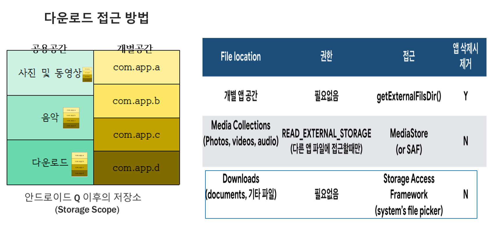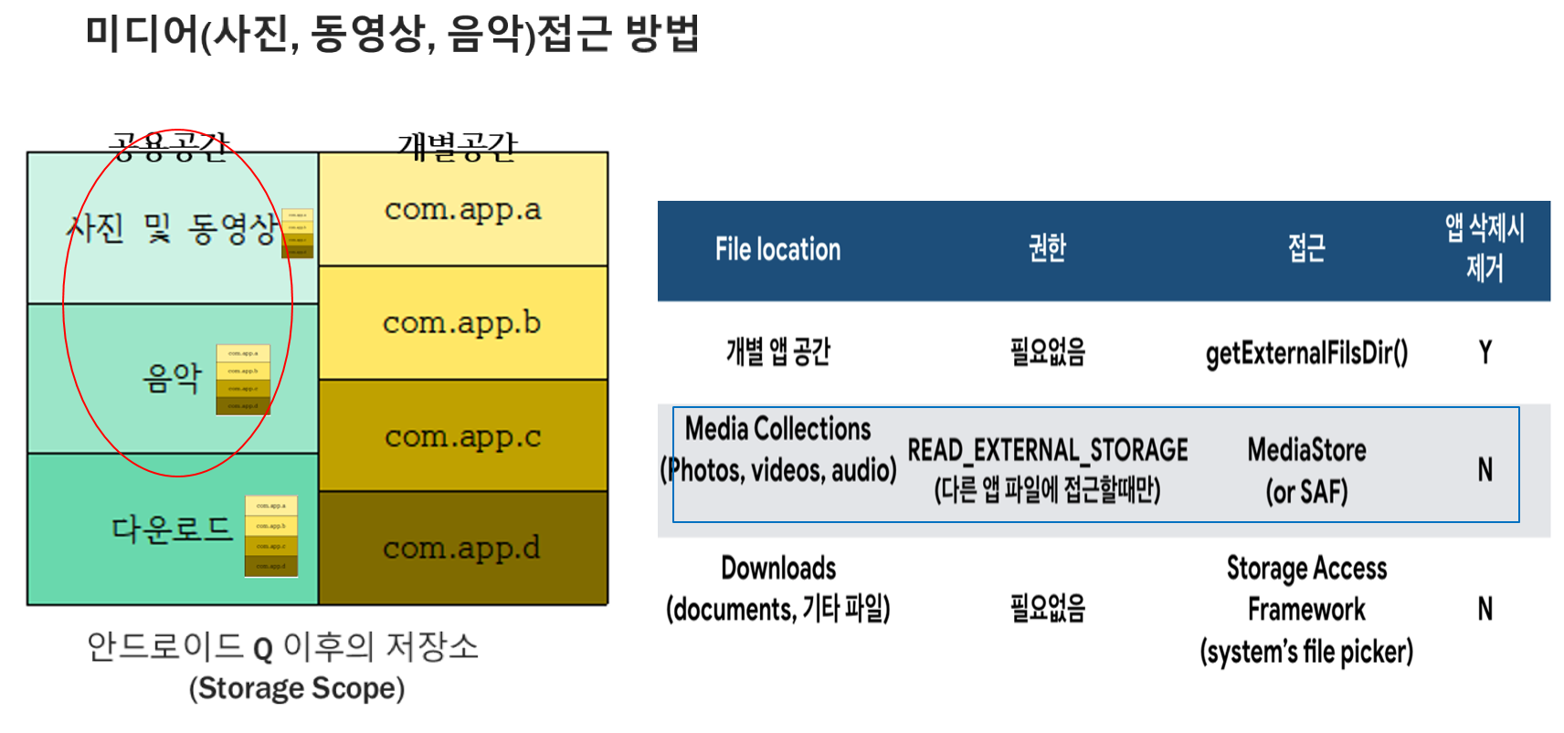 접근은 MediaStore API 를 사용하고 앱이 삭제되도 제거 되지 않는다는 특징을 가지고 있습니다.