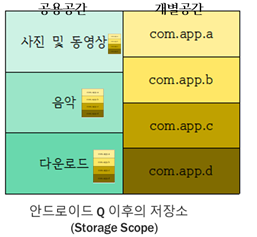 구글에서는 참고로 Scoped Storage를 분화한 컬렉션으로 구분하고 광역 저장소에 대한 접근을 제한한다는 개념이라고 정의하고 있습니다