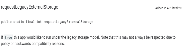 개발자들이 Scoped Storage 에 바로 대응하는데 시간이 걸리고 힘든점을 알기 떄문에 구글에서는 안드로이드 10 버전에서 requestLegacyStorage 를 true로 설정시 영어 해석 그대로 레거시 스토리지 모델을 사용할 수 있게 해줬었습니다.