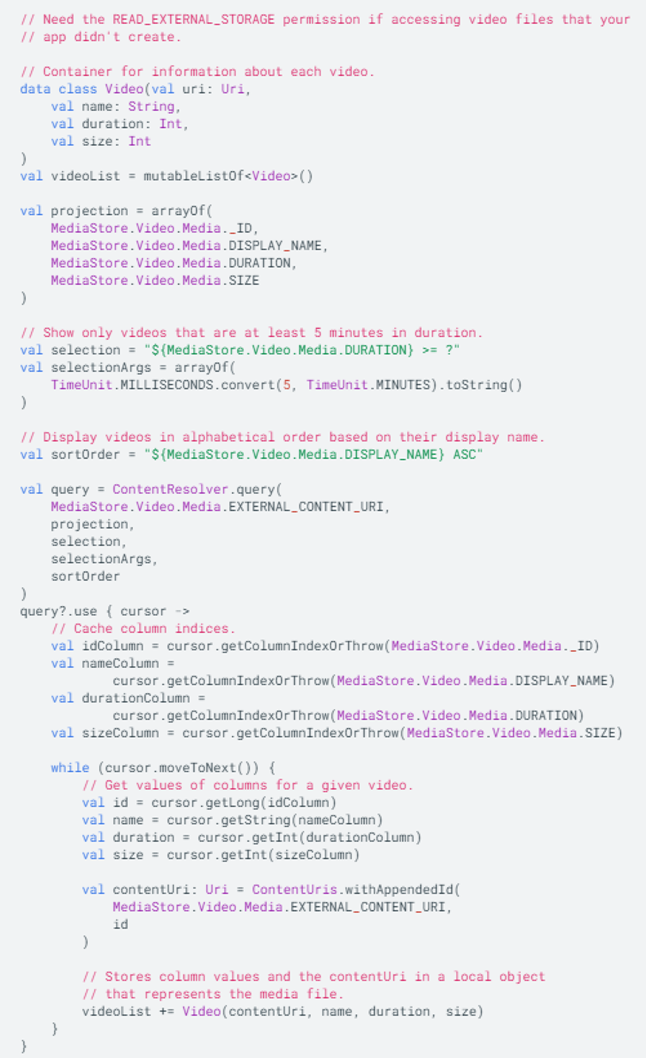 MediaStore API는 다음과 같은 잘 정의된 유형의 미디어 파일에 액세스할 수 있는 인터페이스를 제공합니다. MediaStore는 또한 MediaStore.Files라는 컬렉션도 포함하며, 이 컬렉션을 통해 모든 유형의 미��