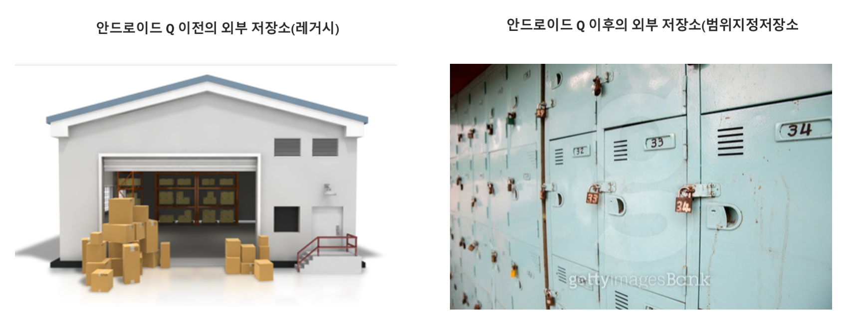 지금까지 말씀 드린 범위지정저장소에 의한 저장공간 변화로 외부저장소를 사용하던 많은 앱들이 영향을 받고 대응이 필요했습니다.