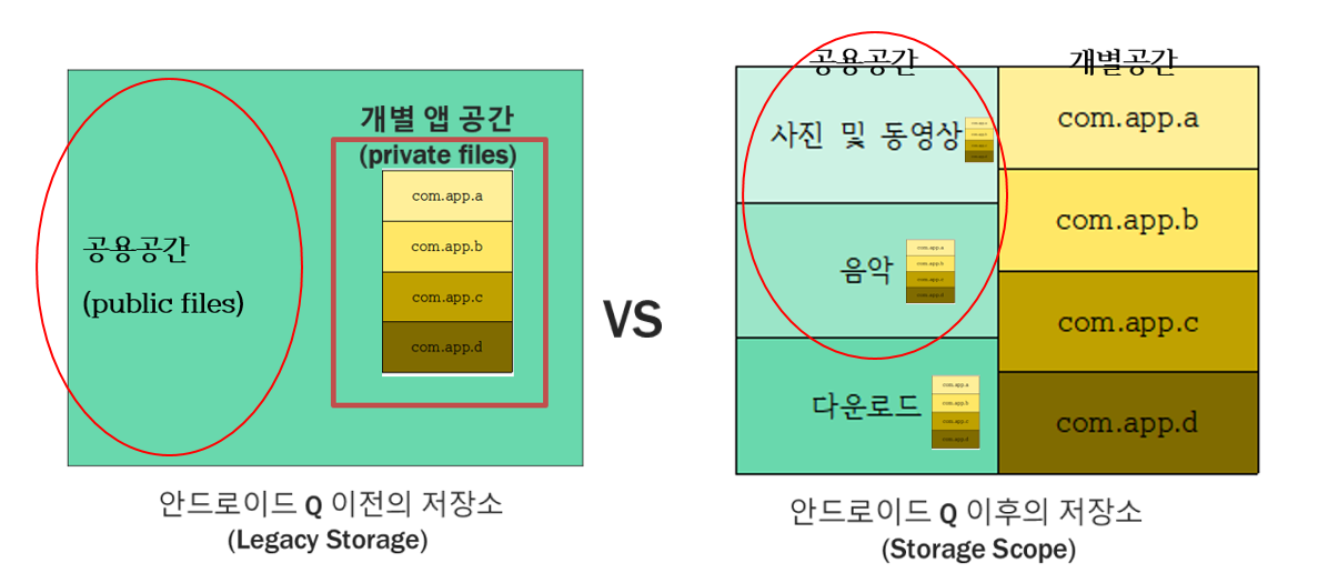 4번에 의해 범위지정저장소는 기존 공간과 파일 소유자(ownership)가 명확히 분리되어 관리가 쉬워지고 앱이 얼마나 많은 저장 공간을 차지하고 있는지 쉽게 확인 이 가능해진다는 장점이 생깁니다. 보안도 좋아지고요.