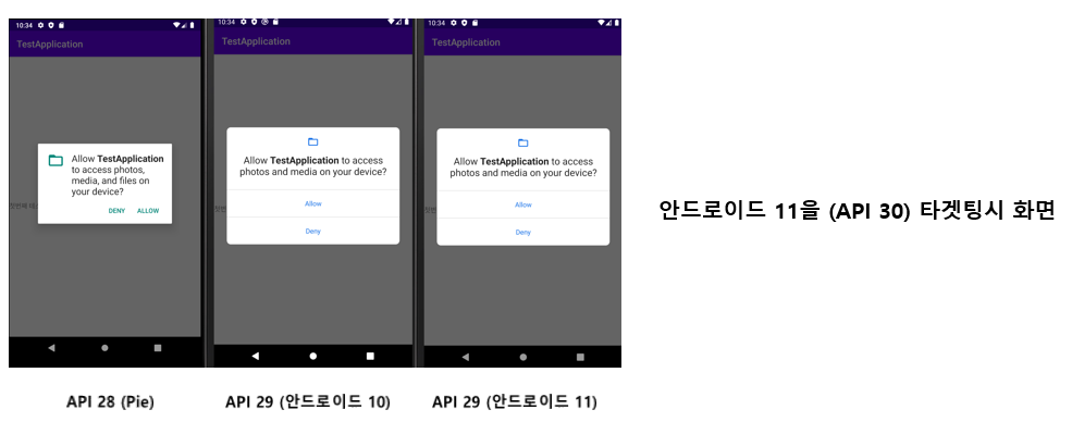 같은 안드로이드 10이여도 범위지정저장소를 적용했냐 안했냐에따라 다른 대화상자가 뜸을 볼 수 있었습니다.