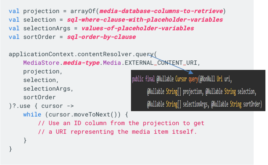 2. 미디어 저장소 추상화와 상호작용하려면 ContentResolver를 사용해 query를 해야하는데 검은색 스니펫을 보시면 Query 메소드가 5개의 파라미터를 필요합니다. 각각의 파라미터를 살펴보면 다음과 같습니다.