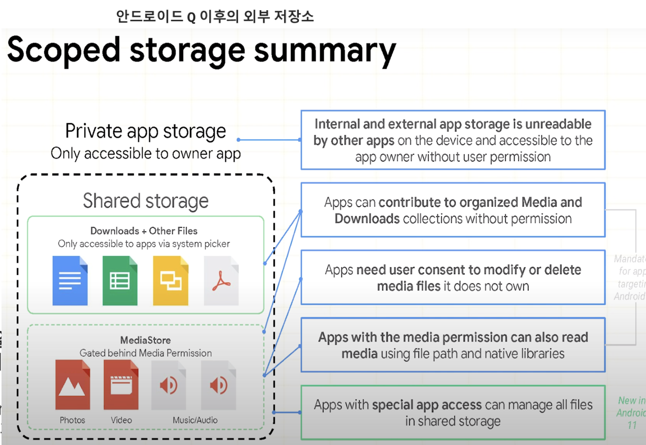 마지막으로 안드로이드 11의 저장공간 관련을 요약하면 다음과 같습니다.