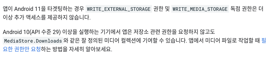 추가적인 내용으로 안드로이드 11부터 저장소 접근 내용이 좀 바꼈습니다.