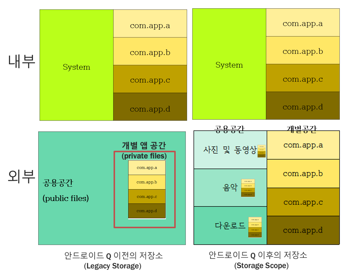 * 그림에서 외부저장소에 공용공간(사진,음악,다운로드)에 패키지 그림도 있어서 햇갈릴까봐 추가 설명을 하면 사진 및 동영상안에 각각의 앱 데이터들이 들어간다는거지 앱의 디렉토리가 생기는게 아닙니다. 즉 외부저장소에서 공용공간과 앱패키지별로의 개인 공간으로 나뉜다보면됩니다.
