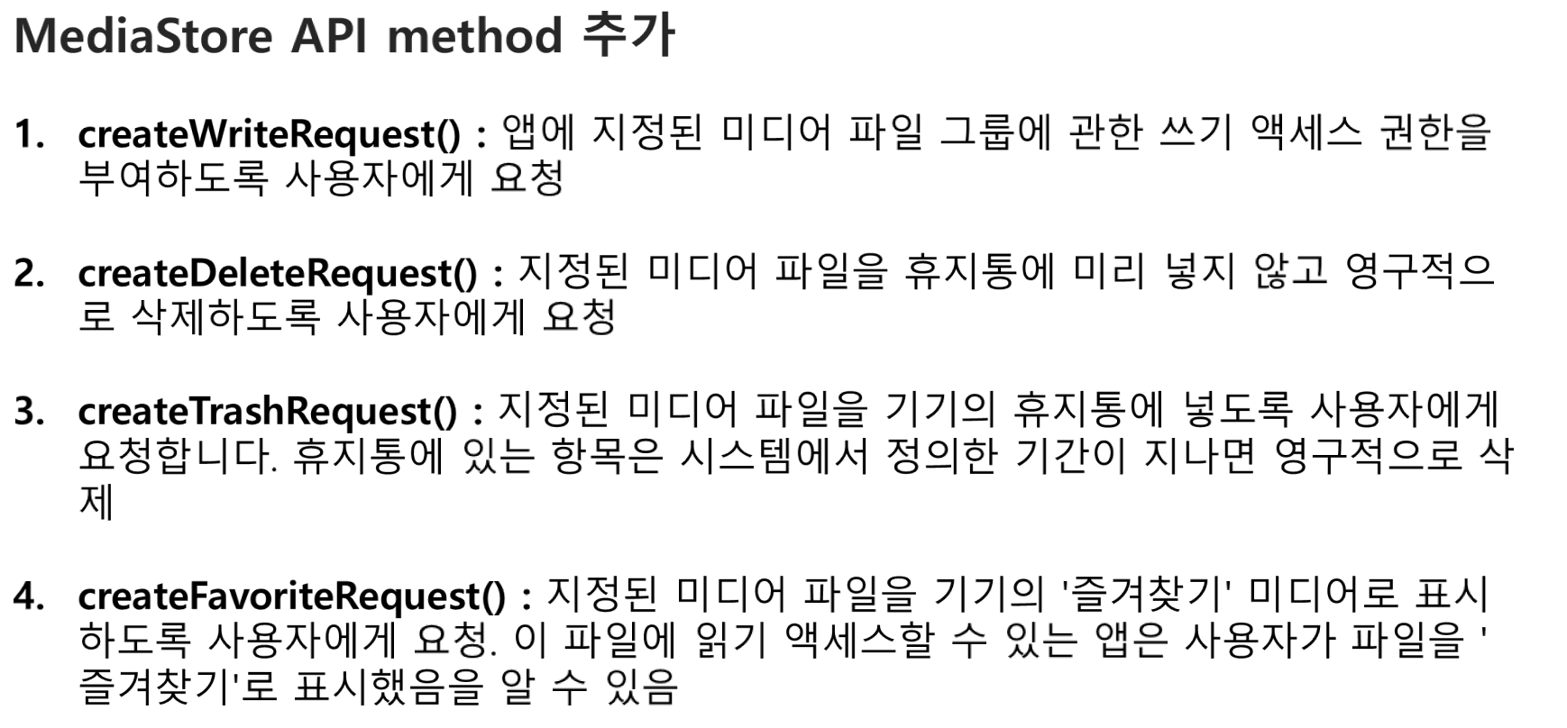 마지막 MediaStore 관련 참고로 구글에서 MediaStore를 밀어주는 만큼 안드로이드 11에서 MediaStore API 관련 method 들이 추가된게 있습니다.