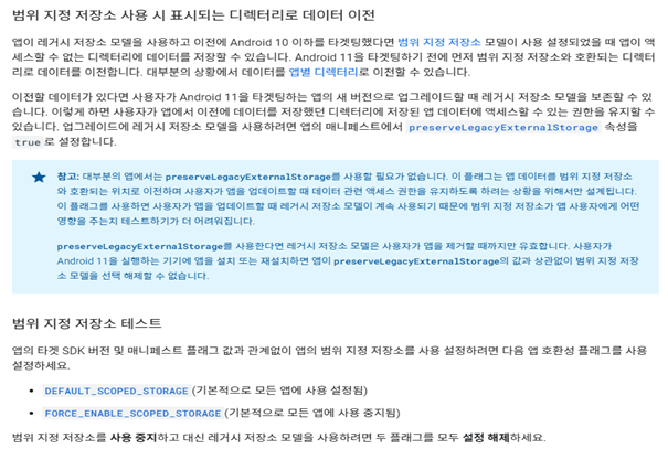 앱의 매니페스트에서 preserveLegacyExternalStorage 속성을 true로 하면 Android 11을 타겟팅하는 앱의 새 버전으로 업그레이드할 때 레거시 저장소 모델을 보존할 수 있으며 사용자가 이전에 데이터를 저장했던 디렉터리에 저장된 앱 데이터에 액세스할 수 있는 권한을 유지할 수 있습니다. 다음은 이에 대한 구글 문서 내용입니다.