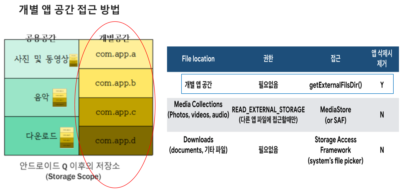 -> 자기 자신의 개별앱 공간의 접근을 위한 권한요청이 필요 없고 getExnternalFilesDir() 을 통해 접근이 가능하며 앱 삭제시 함께 제거됩니다.