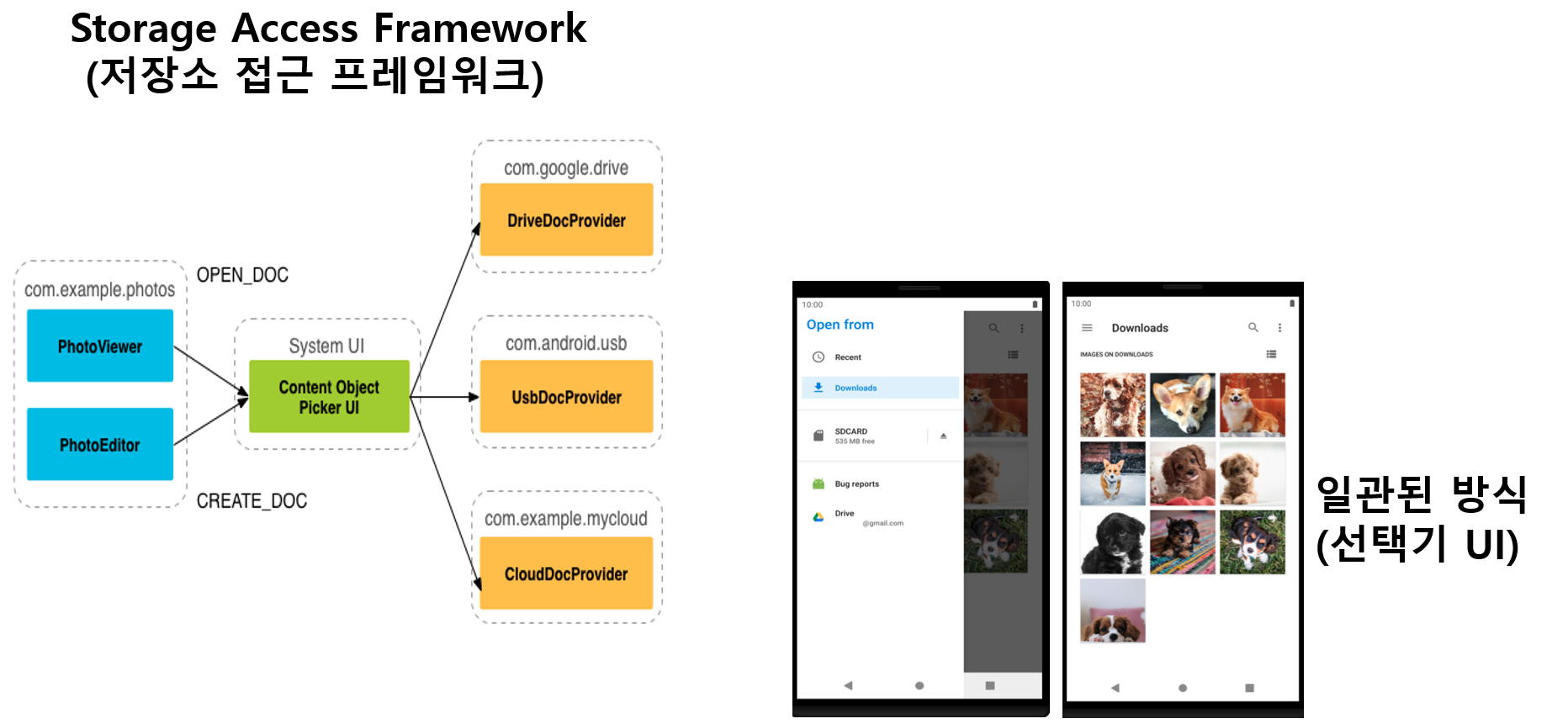 다운로드 공간에 접근하기 위해 사용되며 크게 문서제공자, 선택기 UI, 클라이언트 앱으로 구성되며 사용자가 일관된 방식으로 파일을 탐색하고, 읽고 쓸 수 있는 환경을 제공합니다.