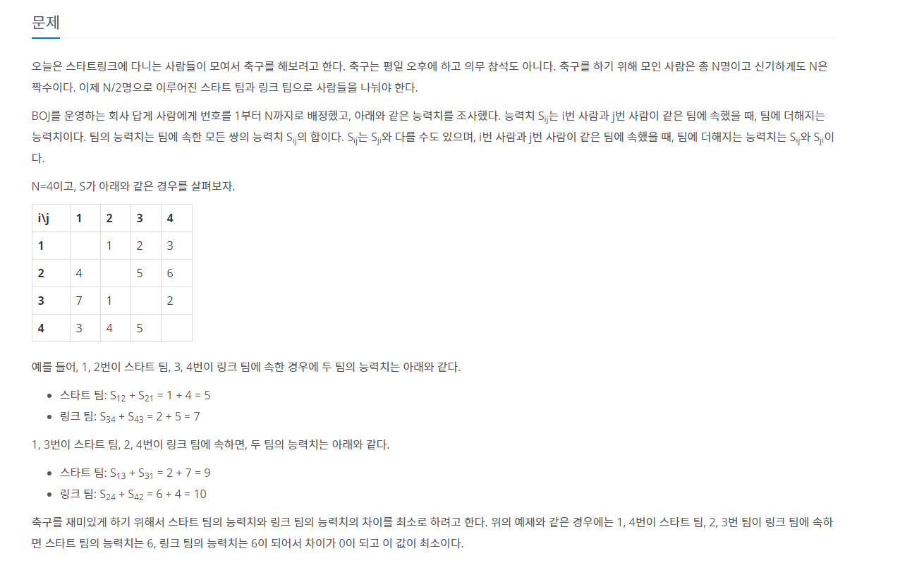 주어진 인원 수와 그 인원들끼리의 시너지 점수가 담긴 2차원 배열을 보고 가장 격차가 적게 스타트팀, 링크팀 두 개의 팀을 짜는게 목표인 문제입니다.