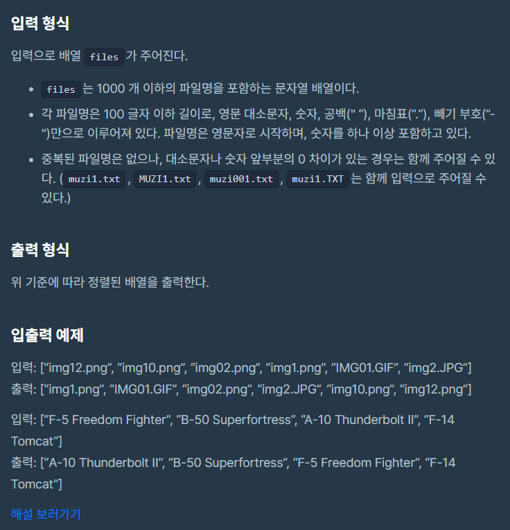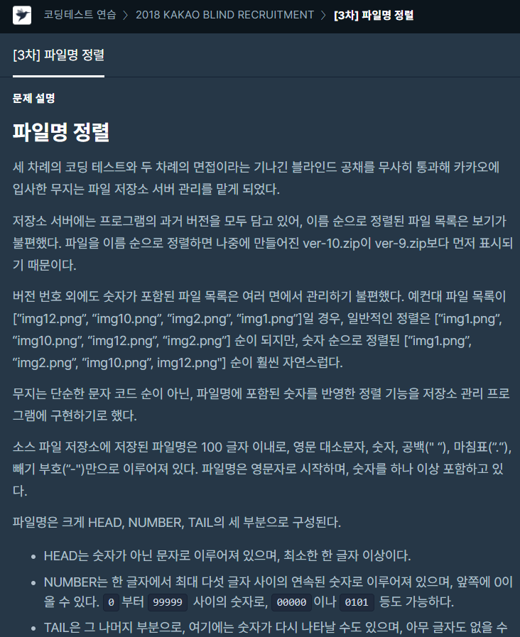 파일명 정렬 세 차례의 코딩 테스트와 두 차례의 면접이라는 기나긴 블라인드 공채를 무사히 통과해 카카오에 입사한 무지는 파일 저장소 서버 관리를 맡게 되었다. 저장소 서버에는 프로그램��