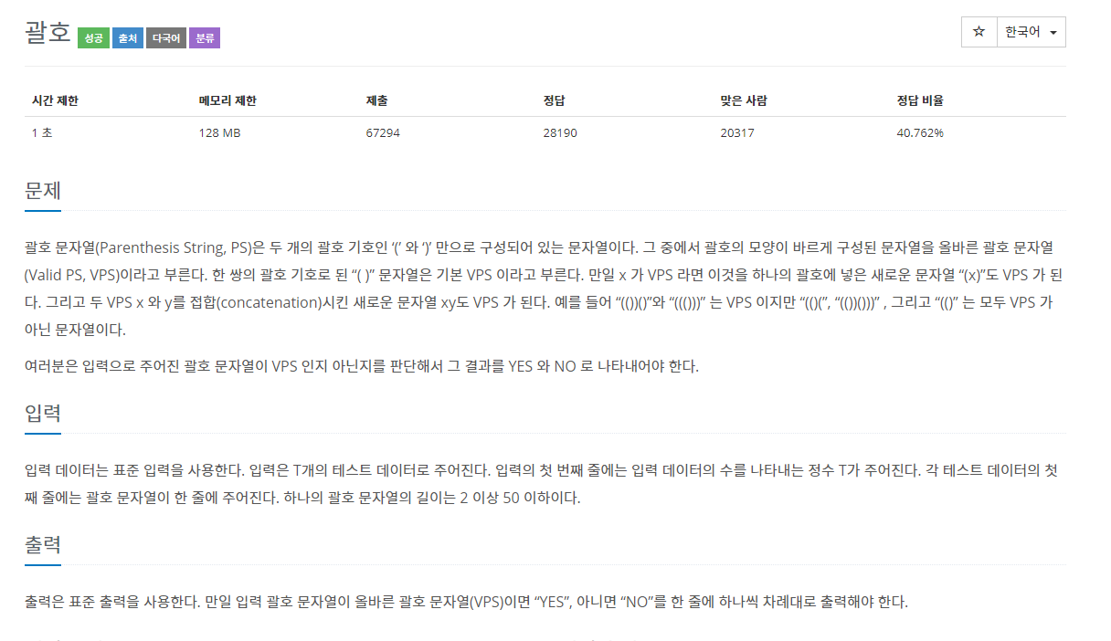 백준 스택 단계별 풀기의 괄호 문제입니다.