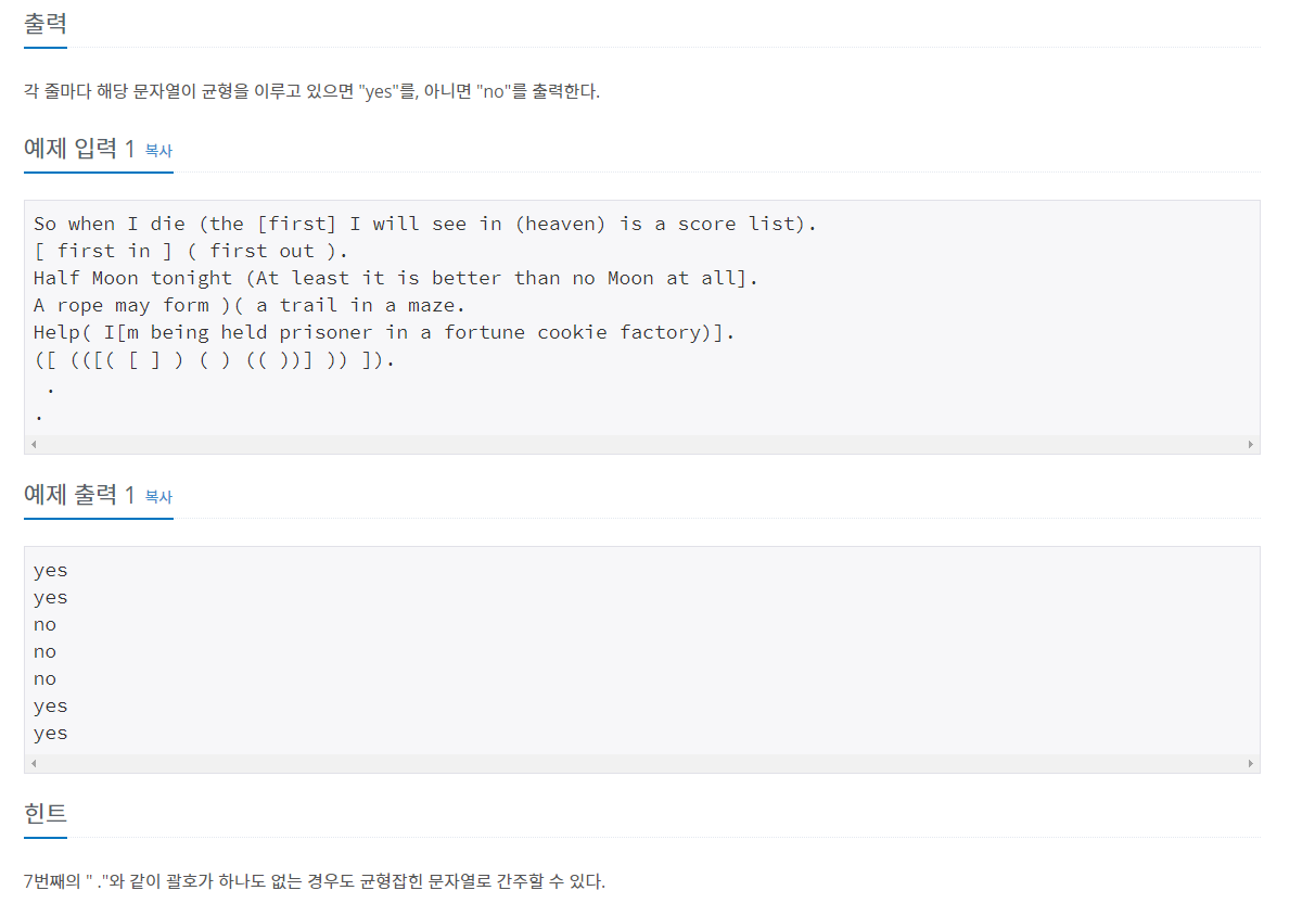 백준 스택 단계별풀기를 하고있습니다. 4단계인 균형잡힌 세상을 풀었습니다.