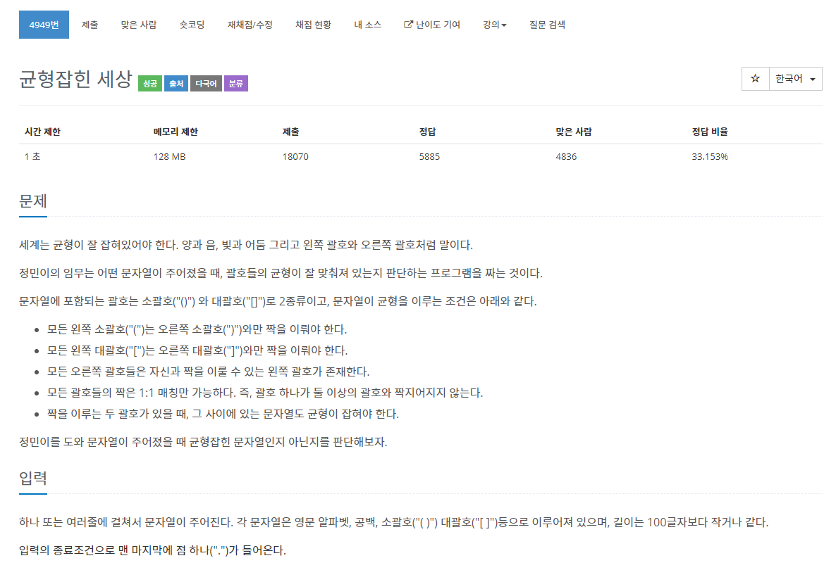 백준 스택 단계별풀기를 하고있습니다. 4단계인 균형잡힌 세상을 풀었습니다.