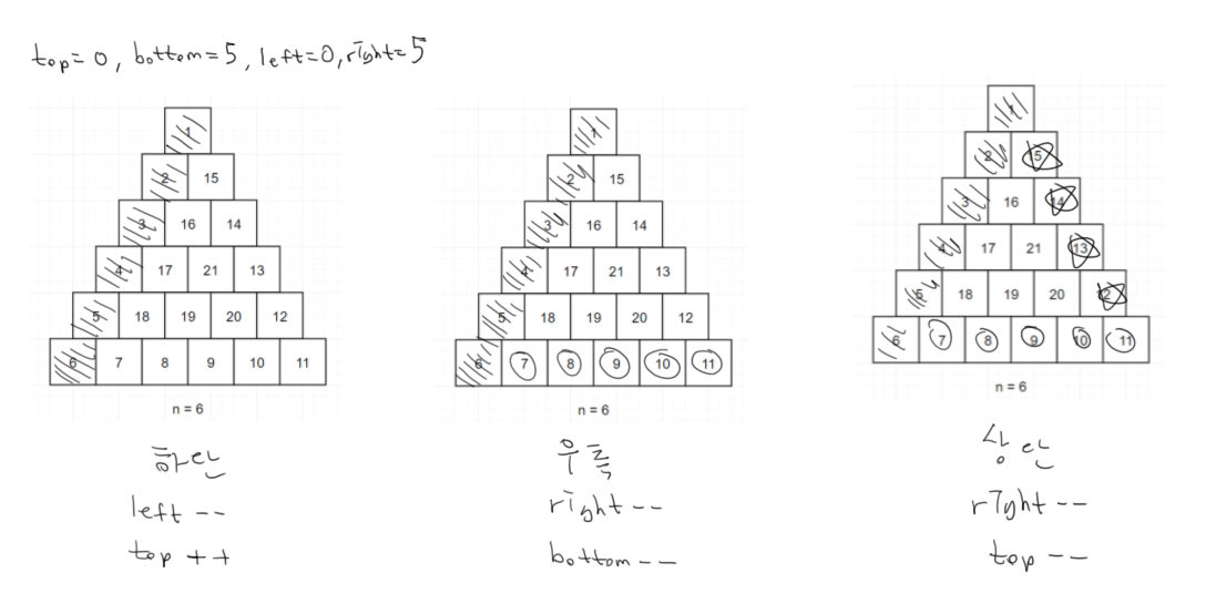 삼각형에서 하단 -> 우측 -> 상단 방향으로 달팽이모양처럼 순서대로 반복해서 값을 넣어주는 문제입니다.