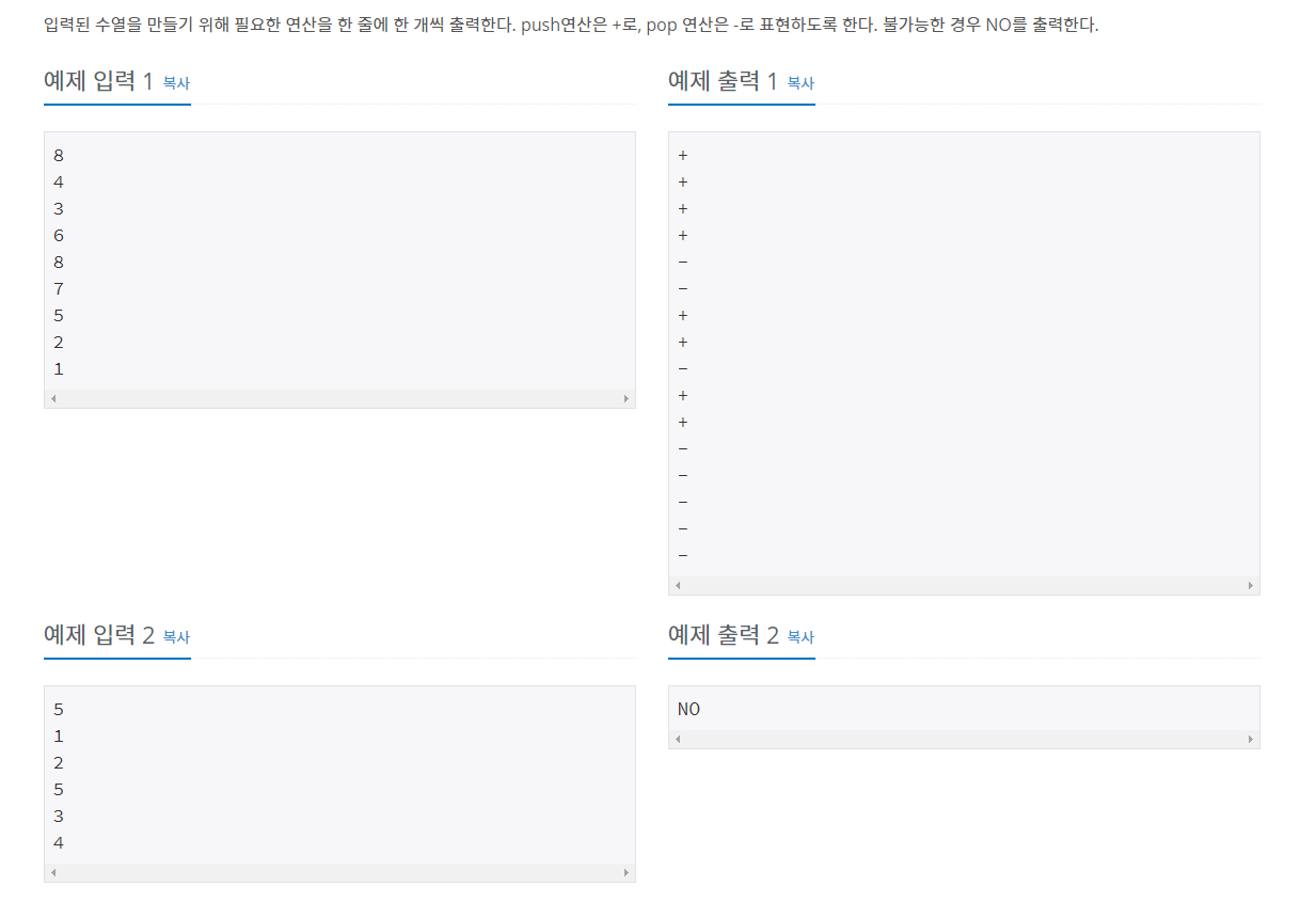 1부터 n까지에 수에 대해 차례로 [push, push, push, push, pop, pop, push, push, pop, push, push, pop, pop, pop, pop, pop] 연산을 수행하면 수열 [4, 3, 6, 8, 7, 5, 2, 1]을 얻을 수 있다.