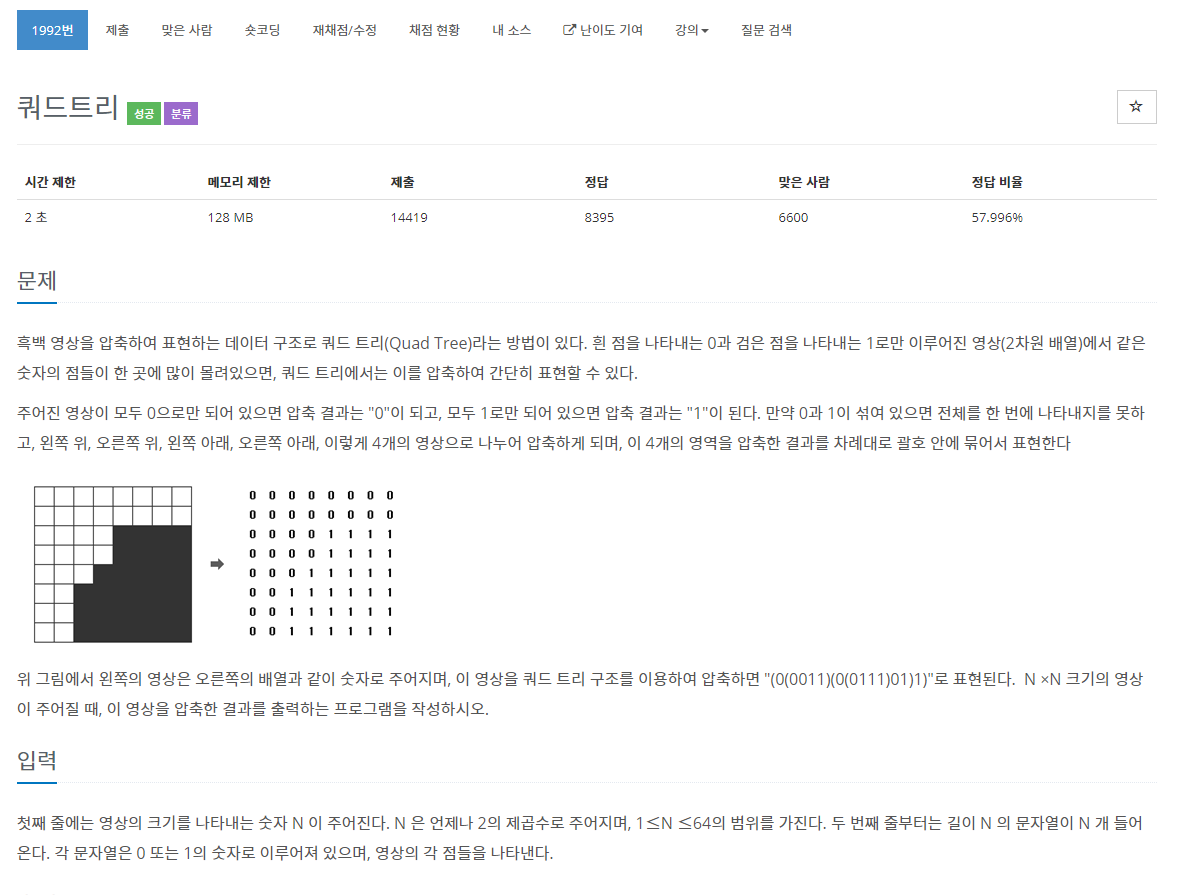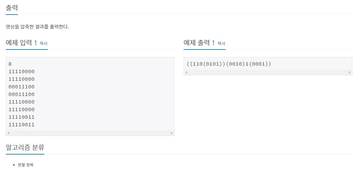 백준 분할정복 단계별풀기 두번째 문제입니다. 이전에 푼 색종이 만들기에서 압축 시 괄호만 해주는거 말고는 거의 동일하다고 볼 수 있습니다.