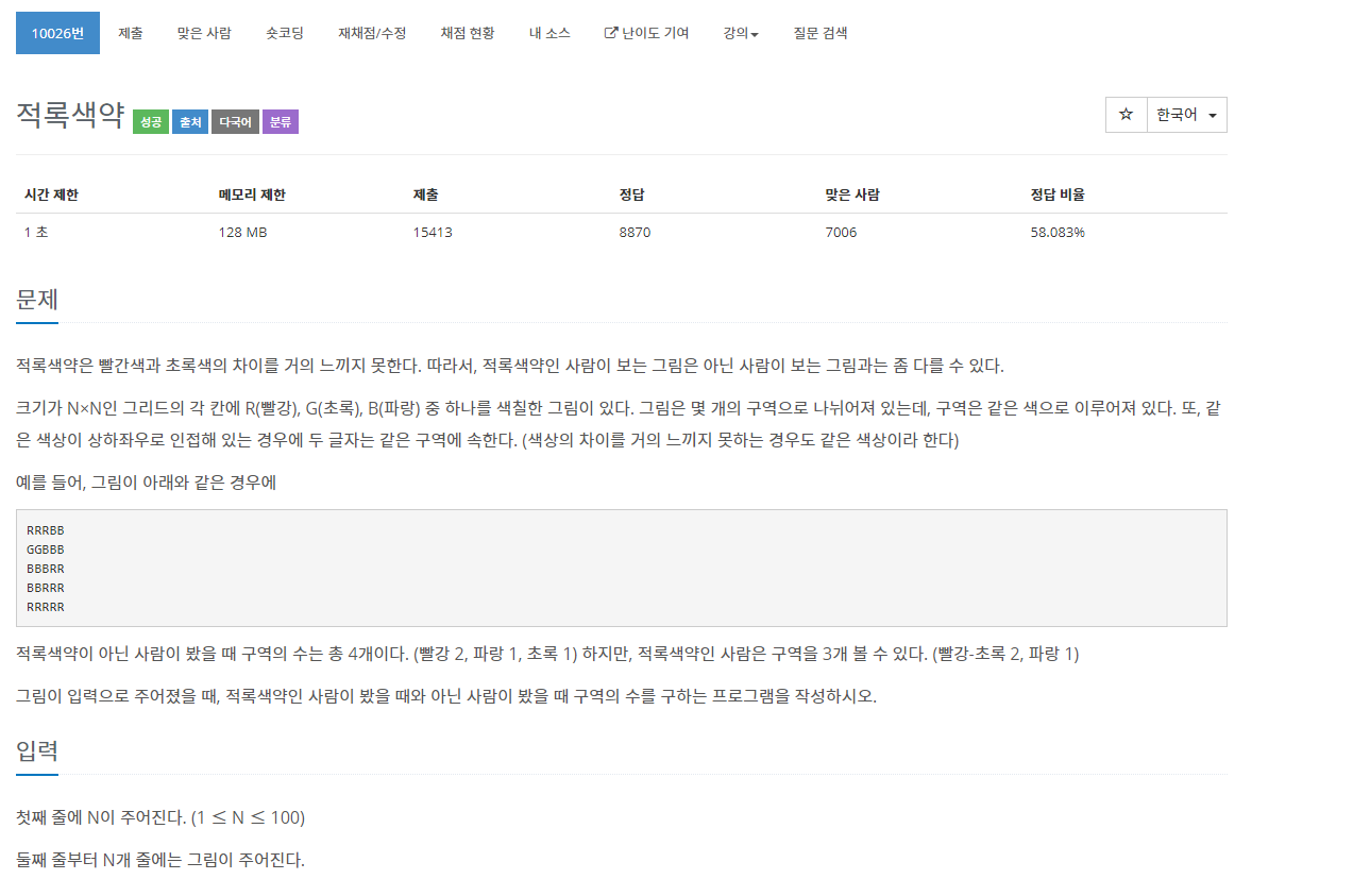 적록색약은 빨간색과 초록색의 차이를 거의 느끼지 못한다. 따라서, 적록색약인 사람이 보는 그림은 아닌 사람이 보는 그림과는 좀 다를 수 있다. 크기가 N×N인 그리드의 각 칸에 R(빨강), G(초록)